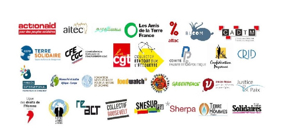 ORGANISATIONS SIGNATAIRES : ActonAid France, AITEC, Alofa Tuvalu, Amis de la Terre France, ATTAC France, Bloom, CADTM France, CCFD-Terre Solidaire, CFE-CGC, CGT, Collectif Éthique sur l’étiquette, Comité Pauvreté et Politique, Confédération paysanne, CRID, Emmaüs International, Foi et Justice Afrique Europe, Fondation Nicolas Hulot pour la Nature et l’Homme, foodwatch France, France Amérique Latine, Greenpeace France, Institut Veblen, Justice et Paix, Ligue des Droits de l’Homme, Notre affaire à tous, ReAct, Réseau Roosevelt, SNESUP-FSU, Sherpa, Terre des Hommes France, Union syndicale Solidaires.
