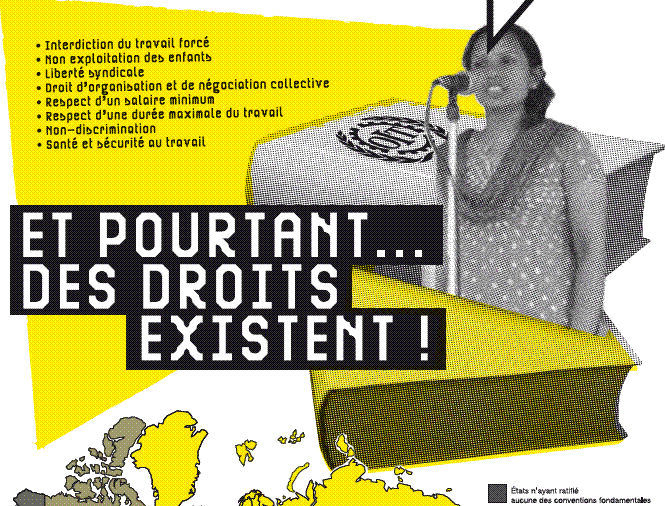 Dans la "famille" des droits humains, les droits économiques, sociaux et culturels (DESC) recouvrent un ensemble d’aspirations humaines fondamentales : se loger, se nourrir, avoir accès à l’éducation, à un système de santé, etc. Le droit à un travail digne est l’un d’entre eux. Tout travailleur doit se voir respecter ses droits fondamentaux au travail issus des normes internationales qui définissent des principes universels tels que l’interdiction du travail forcé, la non-exploitation des enfants, la liberté syndicale ou le respect d’une durée maximale du travail. Ces droits concernent tous les travailleurs, pour tout type de travail, partout dans le monde. Ils sont inscrits, promus et protégés par plusieurs textes internationaux, élaborés dans le cadre des Nations Unies au fur et à mesure des progrès de l’industrialisation, de la mondialisation et de l’accroissement de la libération des échanges, pour assurer une protection égale pour tous.