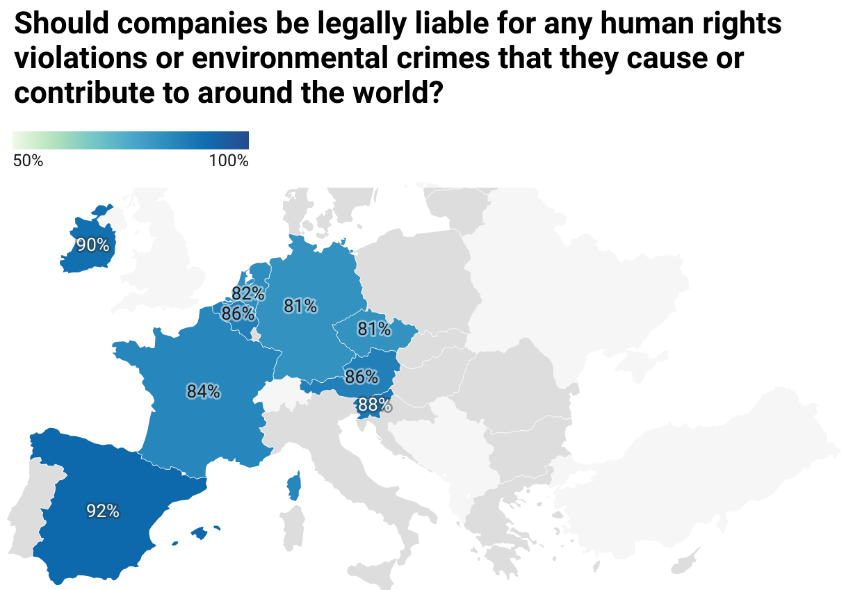 Plus de 80 % des citoyen·nes européen·nes souhaitent des législations ambitieuses afin de tenir les entreprises juridiquement responsables de violations des droits humains et les atteintes à l’environnement qu’elles commettent, notamment à l’étranger. Selon un sondage YouGov publié aujourd’hui, les citoyen.nes européen.nes estiment également que les personnes affectées par de telles violations doivent pouvoir poursuivre les entreprises responsables devant les tribunaux européens.