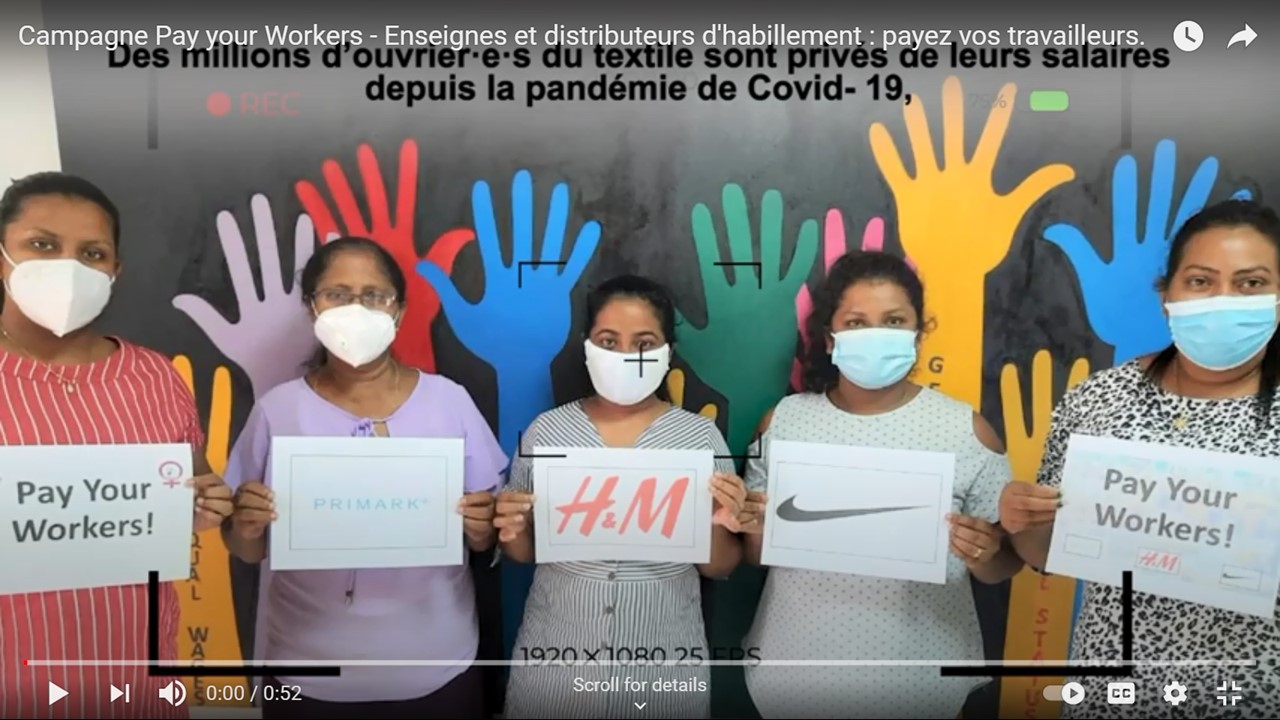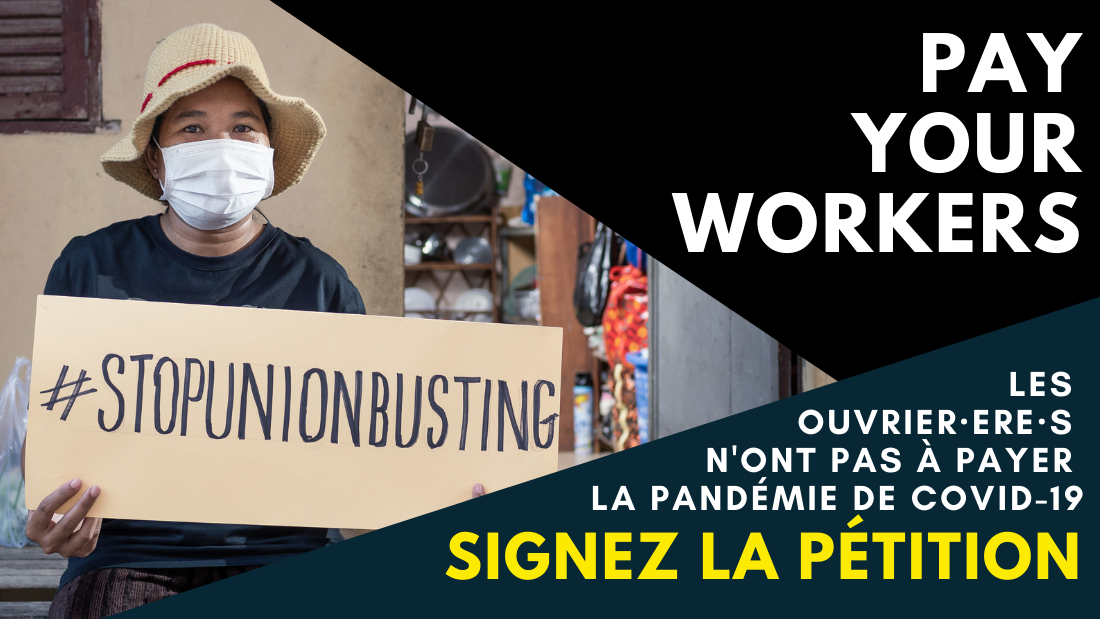 Depuis le début de la pandémie, des millions de travailleuses et travailleurs de la confection perdent leur emploi, font face à des pertes de salaire et à des licenciements sans indemnisation, victimes immédiates de la crise mondiale qui frappe le secteur. Amputé·e·s d’une partie de leurs revenus, ils ne peuvent plus nourrir leurs familles. Les multinationales de l’habillement pourraient garantir leurs salaires avec seulement 10 centimes par t-shirt. Mais elles préfèrent laisser les travailleur·euse·s payer pour la crise. Demandons-leur : Pay Your Workers !
