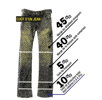 De plus, le terme " main d’œuvre " englobe bien plus de salariés que l’ouvrier de la chaîne de fabrication (le personnel d’encadrement par exemple). Ce qui est important de déduire de ce schéma, c’est que, sur l’ensemble des coûts de l’entreprise conceptrice du produit (ici, Nike), très peu concernent la main d’œuvre. Ainsi, une augmentation du salaire des ouvriers n’influencerait en rien le prix de vente en rayon (qui est fixé sur des critères marketing). Le schéma met en outre en évidence la responsabilité du distributeur ou de la marque vis-à-vis de ses sous-traitants.