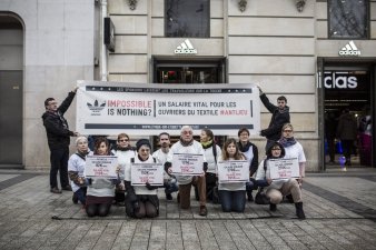 Samedi 28 janvier dernier, à l’occasion du mondial de Handball dont Adidas est sponsor officiel, nous avons rappelé à l’équipementier sportif leader en Europe que son slogan "Impossible is nothing" n’a aucun sens lorsque les ouvriers de ses chaînes d’approvisionnement ne gagnent pas de quoi vivre décemment, lors d’un happening devant sa boutique des Champs-Elysées.