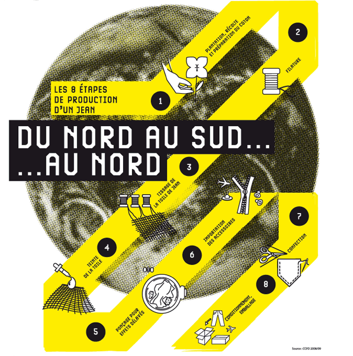 La plupart des vêtements que nous achetons en France sont fabriqués à l’autre bout du monde via des filières de production complexes et ramifiées. Un jean par exemple, entre la culture du coton et la mise en vente dans nos magasins, peut parcourir 65000 km, soit une fois et demi le tour de la planète.