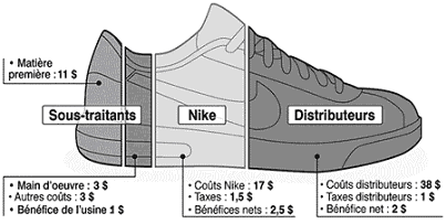 En effet, le prix de vente de la chaussure varie en fonction du magasin où on l’achète, si elle est en solde ou non, etc. Il n’y a donc aucune proportionnalité entre le prix de vente d’un objet et le salaire d’un ouvrier. D’ailleurs, une basket est fabriquée par de nombreux ouvriers, qui occupent chacun une étape de la confection des chaussures, bien souvent éclatée entre différents pays, et ces mêmes ouvriers peuvent très bien fabriquer dans le même temps des baskets pour une autre marque. Lire la suite