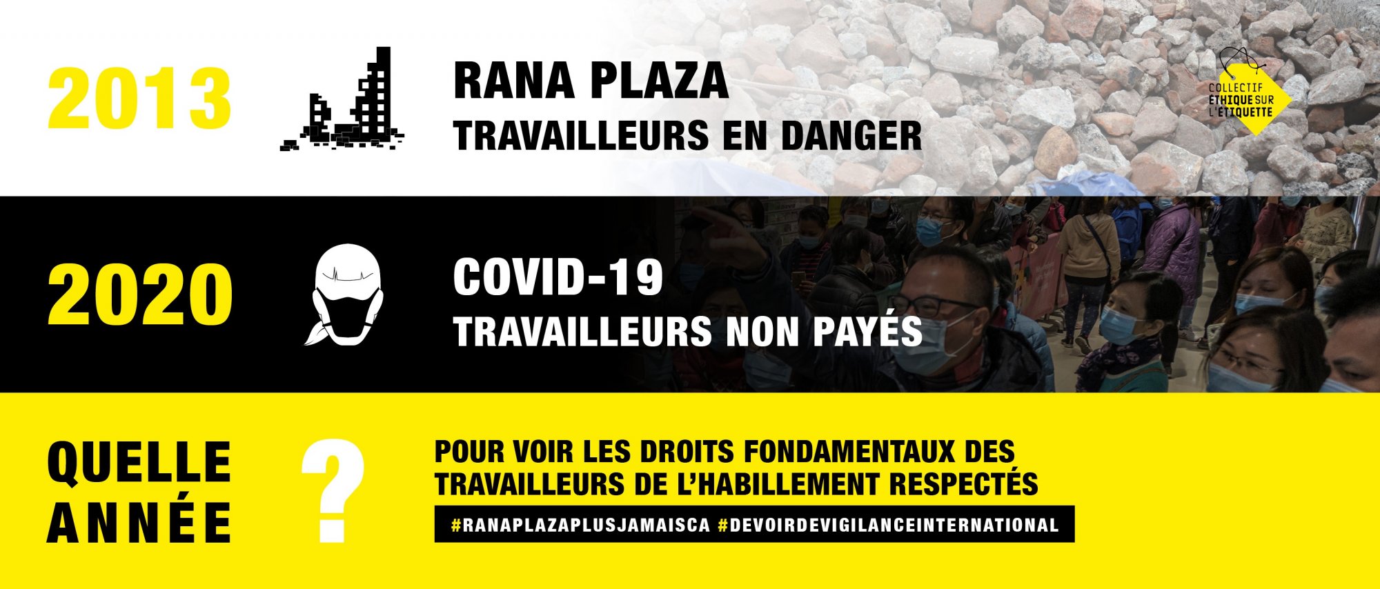 Dans l’immédiat, nous enjoignons les donneurs d’ordre du secteur à se reprendre et à assumer leur obligation de vigilance : honorer leurs commandes, les rééchelonner le cas échéant, accompagner leurs fournisseurs dans le versement des salaires et des éventuelles indemnités de leurs employé-e-s, assurer leur protection ou le droit à un arrêt maladie pour celles et ceux atteints du coronavirus ou en présentant des symptômes.