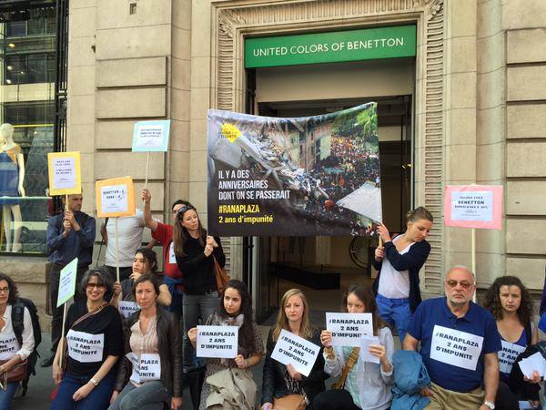 Il y a des anniversaires dont on se passerait. Le Collectif Éthique sur l’étiquette l’a rappellé à Benetton, aux multinationales de l’habillement et au gouvernement français ce vendredi 24 avril, 2 ans jour pour jour après l’effondremendu Rana Plaza, lors d’une action devant une boutique de la marque.