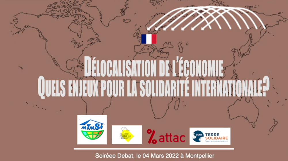 Le Collectif 34 "Régulation et transparence des entreprises", ATTAC, le CCFD-Terre Solidaire et le Collectif Ethique sur l’étiquette organisent une soirée-débat sur l’impact de la désindustrialisation et des délocalisations et les enjeux qu’elles posent notamment en matière de solidarité internationale.